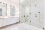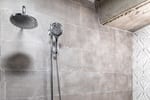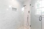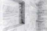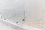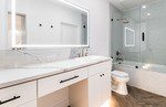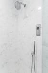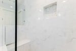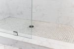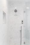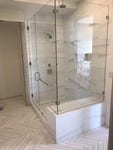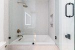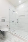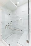 Our team installed a new shower/spa system with frameless floor-to-ceiling shower glass walls, steam accessories, new floating vanity, wall hung commode and tile.