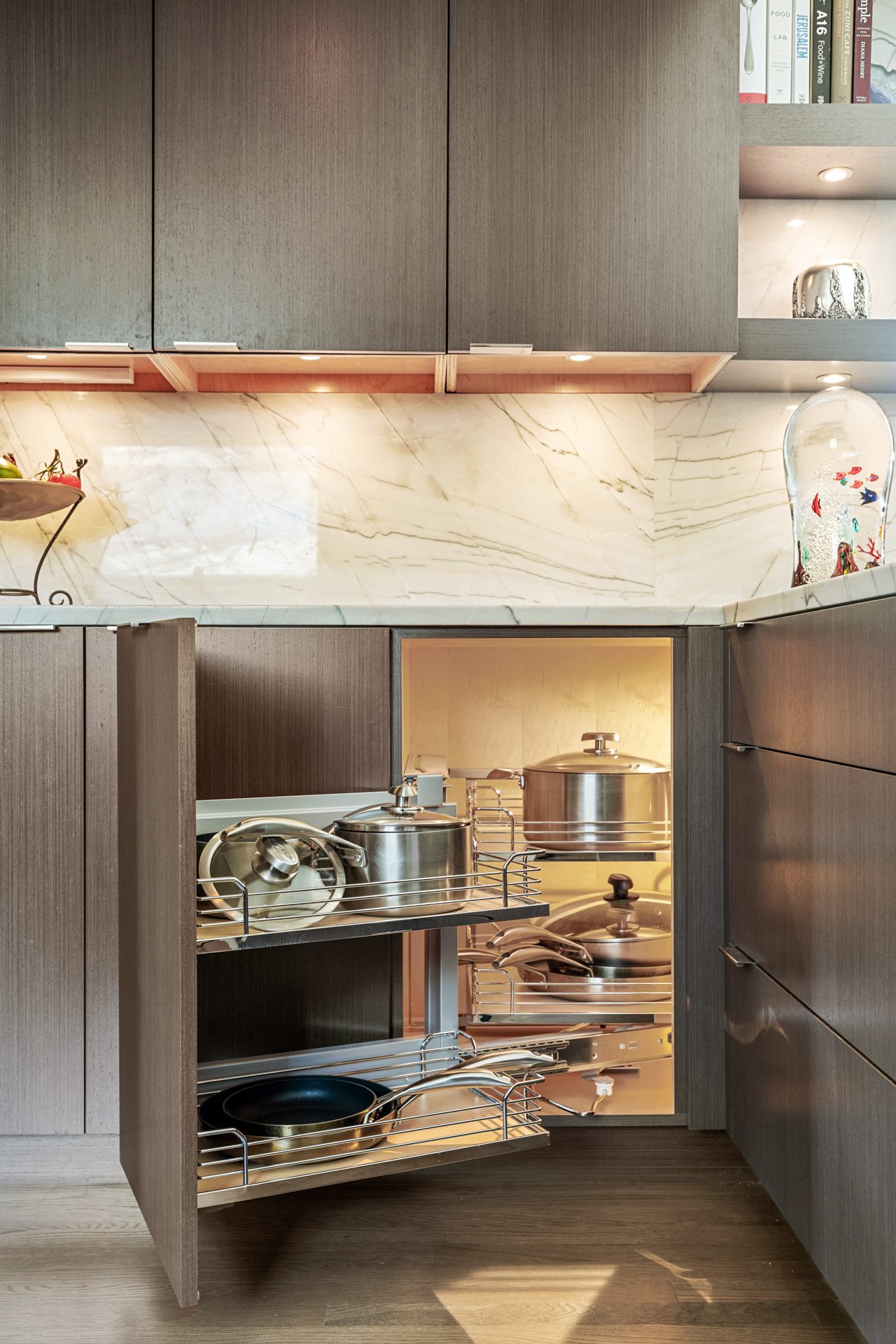 The genius magic cabinets at one of the kitchen corners are lit from within, making easy access to pots and pans. Another magic corner works as a hidden bar cart at the opposite corner near the entrance.