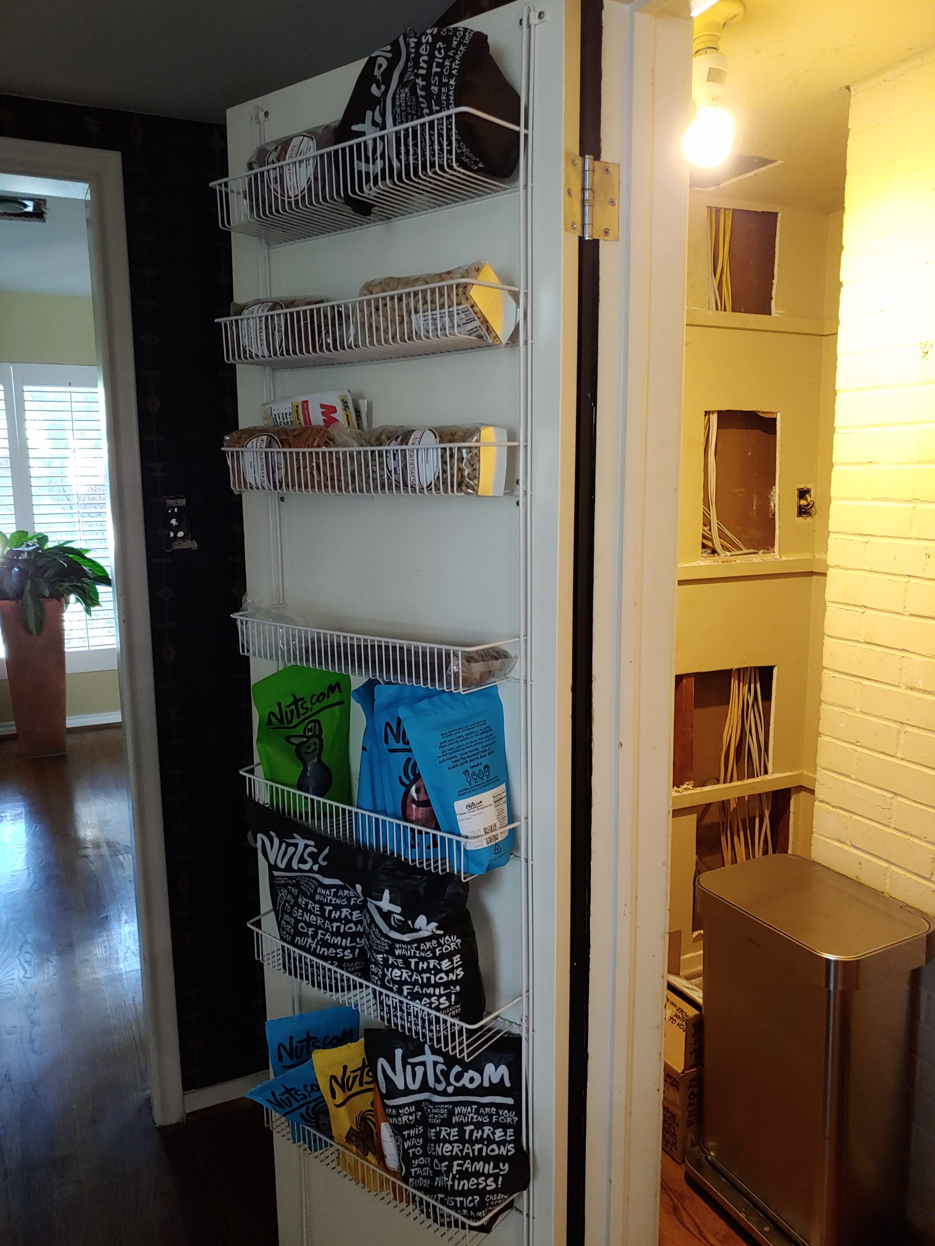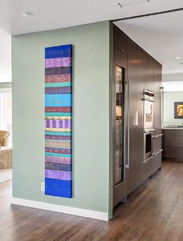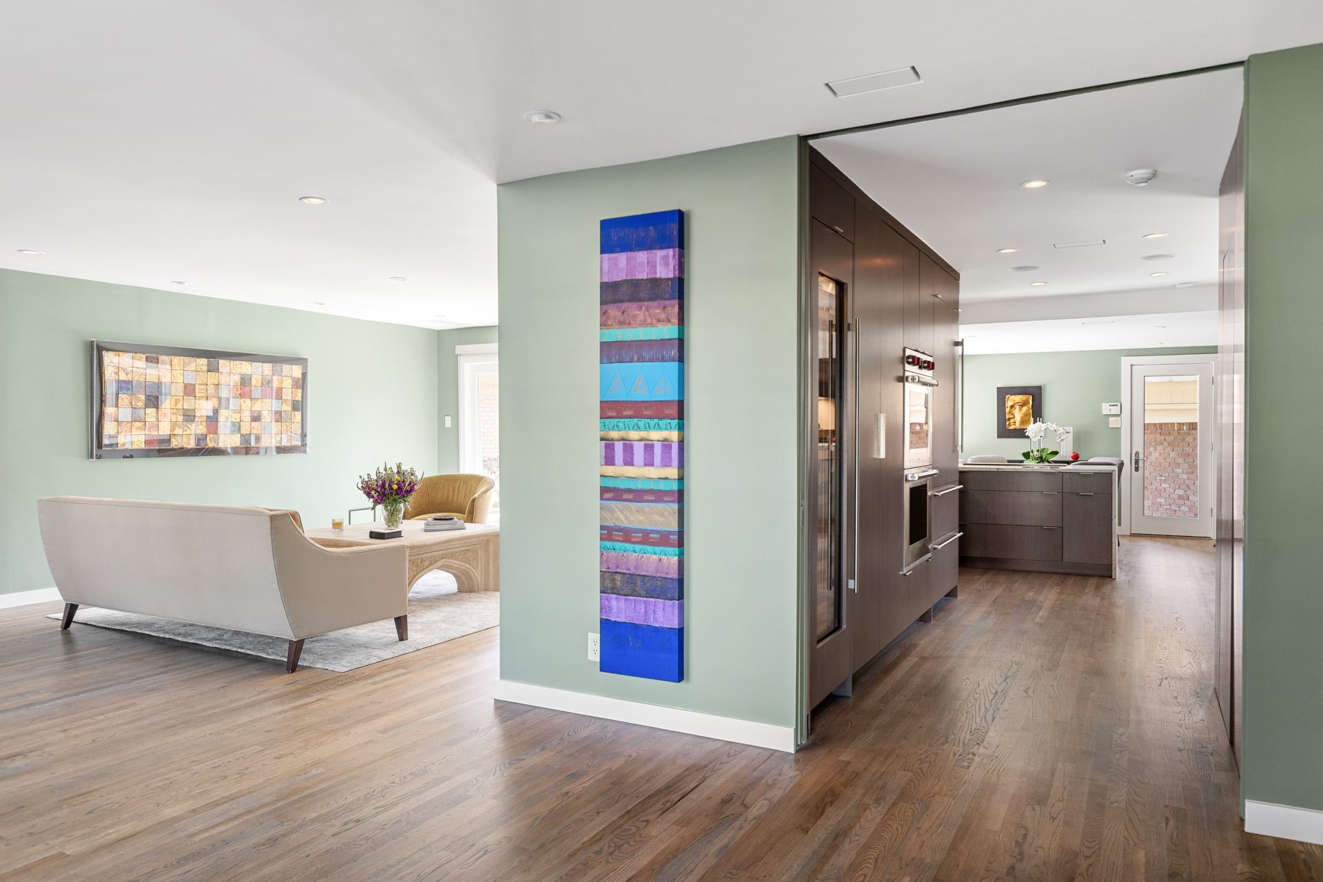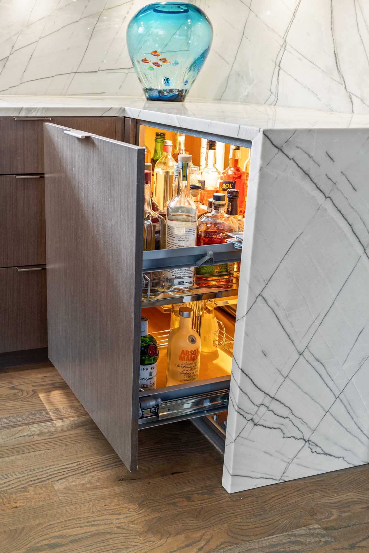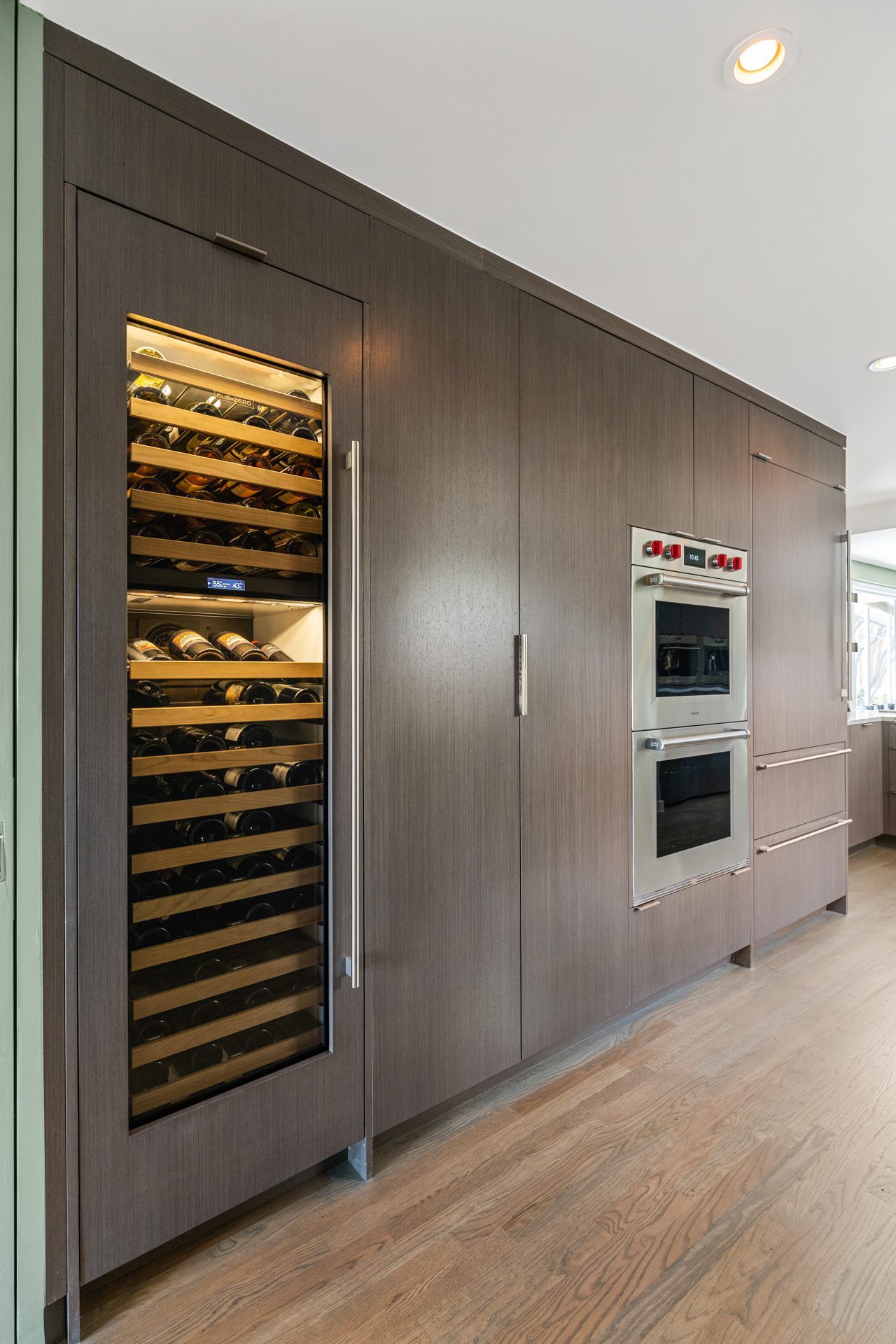 When hidden space was uncovered behind a wall, it became useful for a wall housing a Sub-Zero Designer wine storage unit, Panel-Ready integrated refrigerator, Wolf double ovens, and Pantry with small appliances.