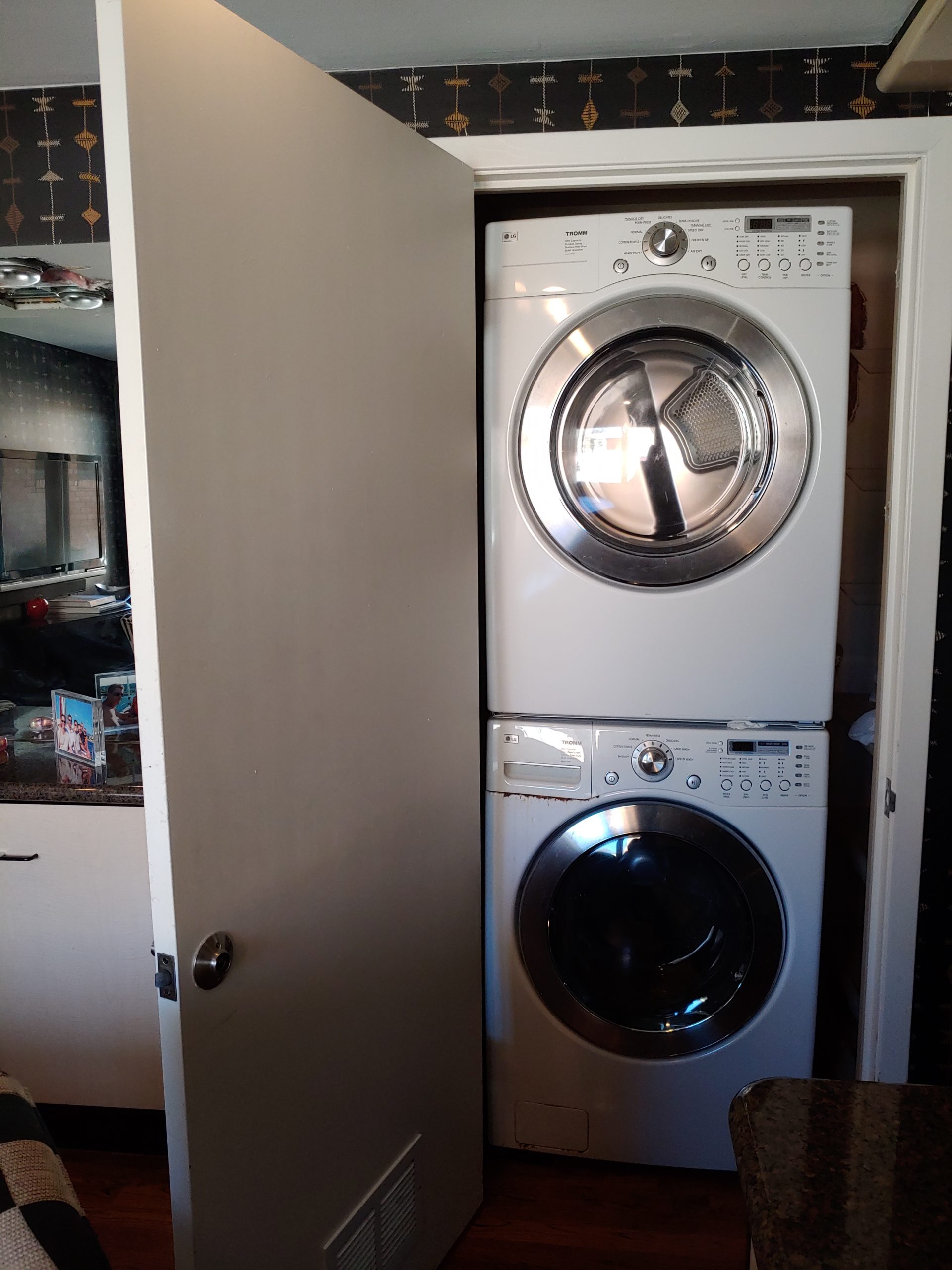 The original kitchen housed a stacked washer and dryer within a small closet. The closet was removed to make room for a side-by-side layout, and a Wolf coffee maker and microwave were added above.