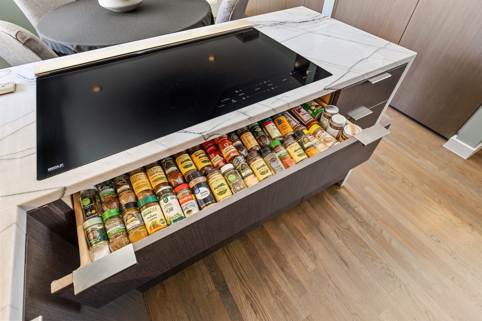 A contemporary Wolf induction cooktop replaced the old cooktop and made room for a spice drawer directly underneath.