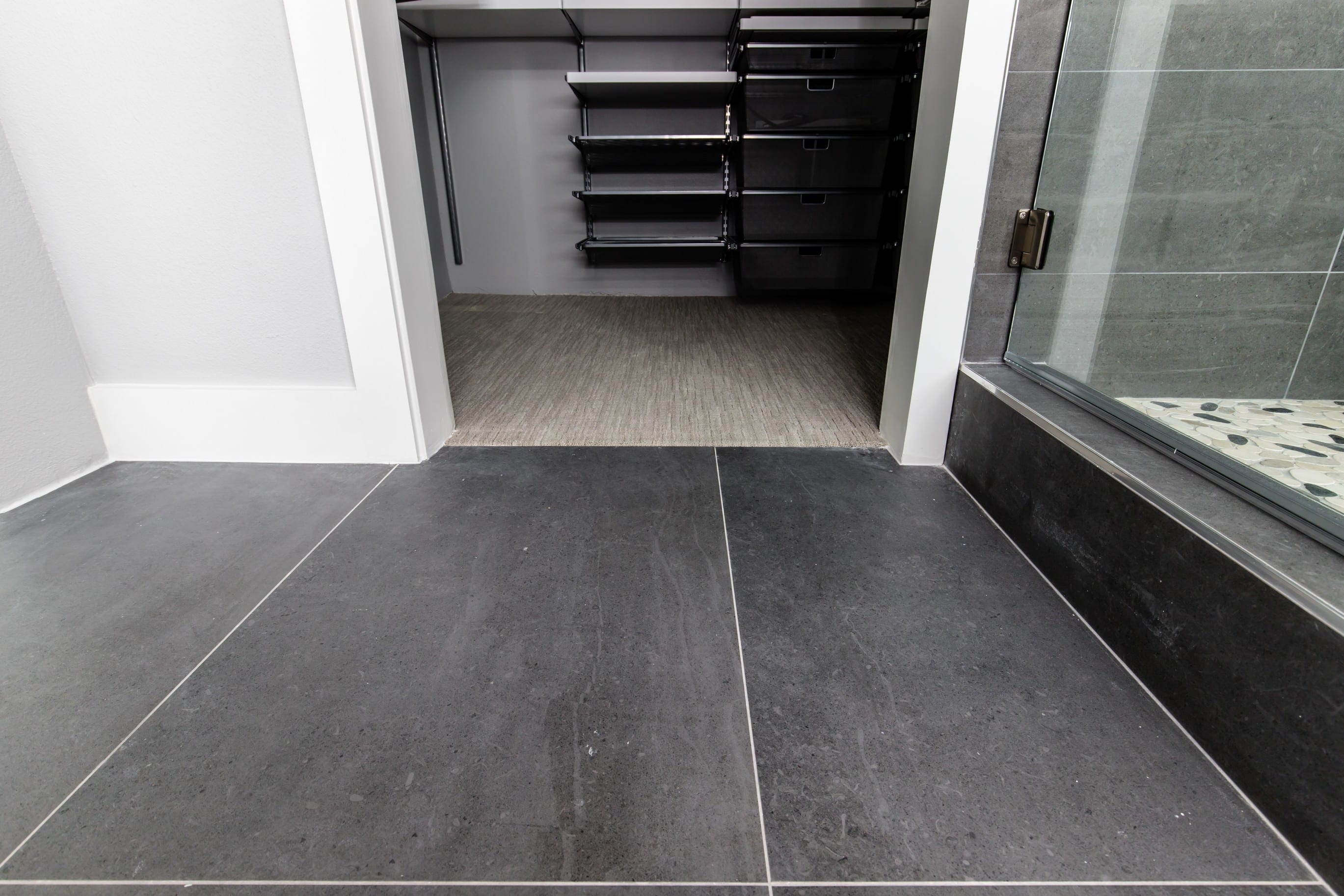 The owners chose the Uptown™ Glazed Porcelain Series by Emser Tile because it features subtle textures and color variation giving their master bathroom a timeless, urban feel