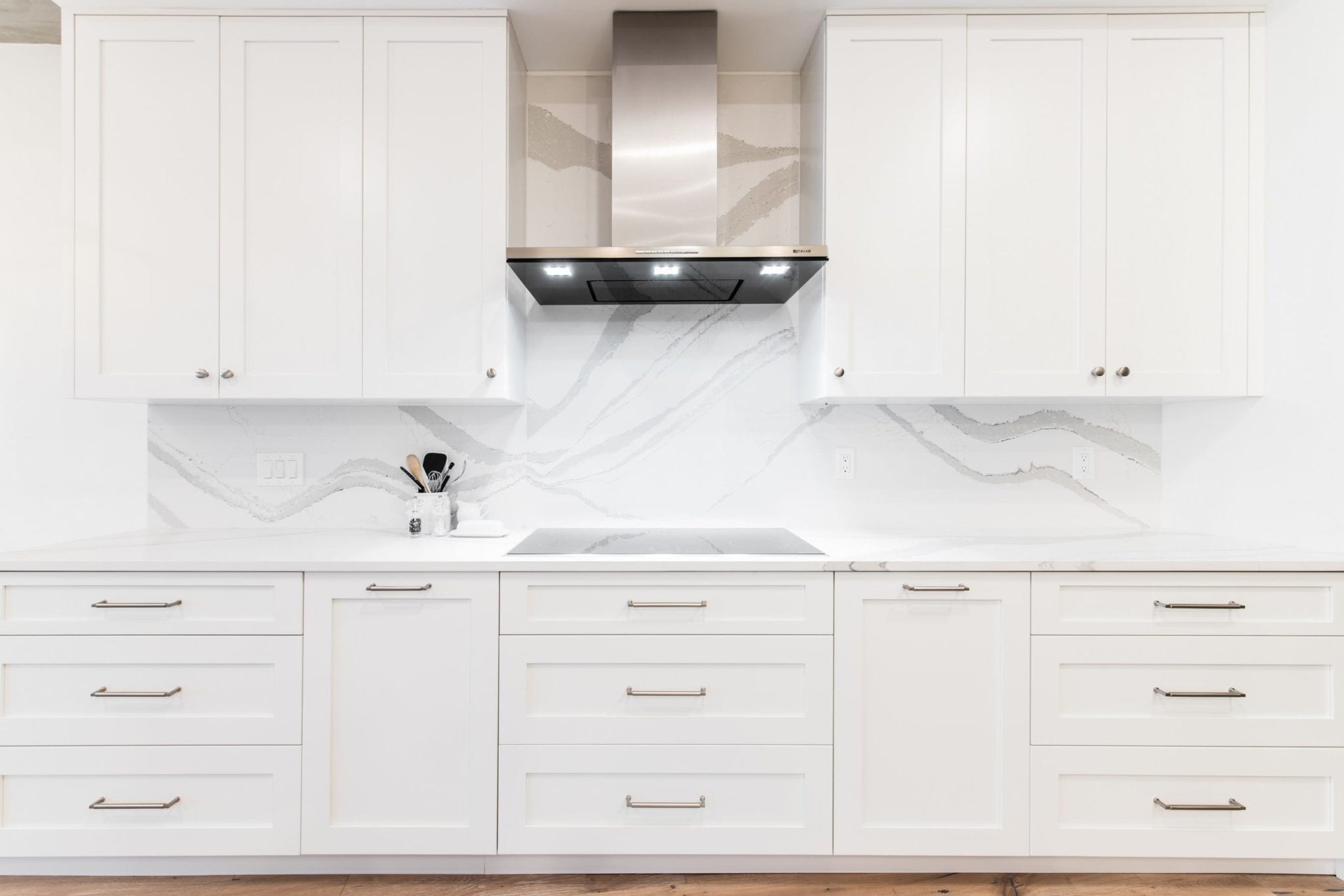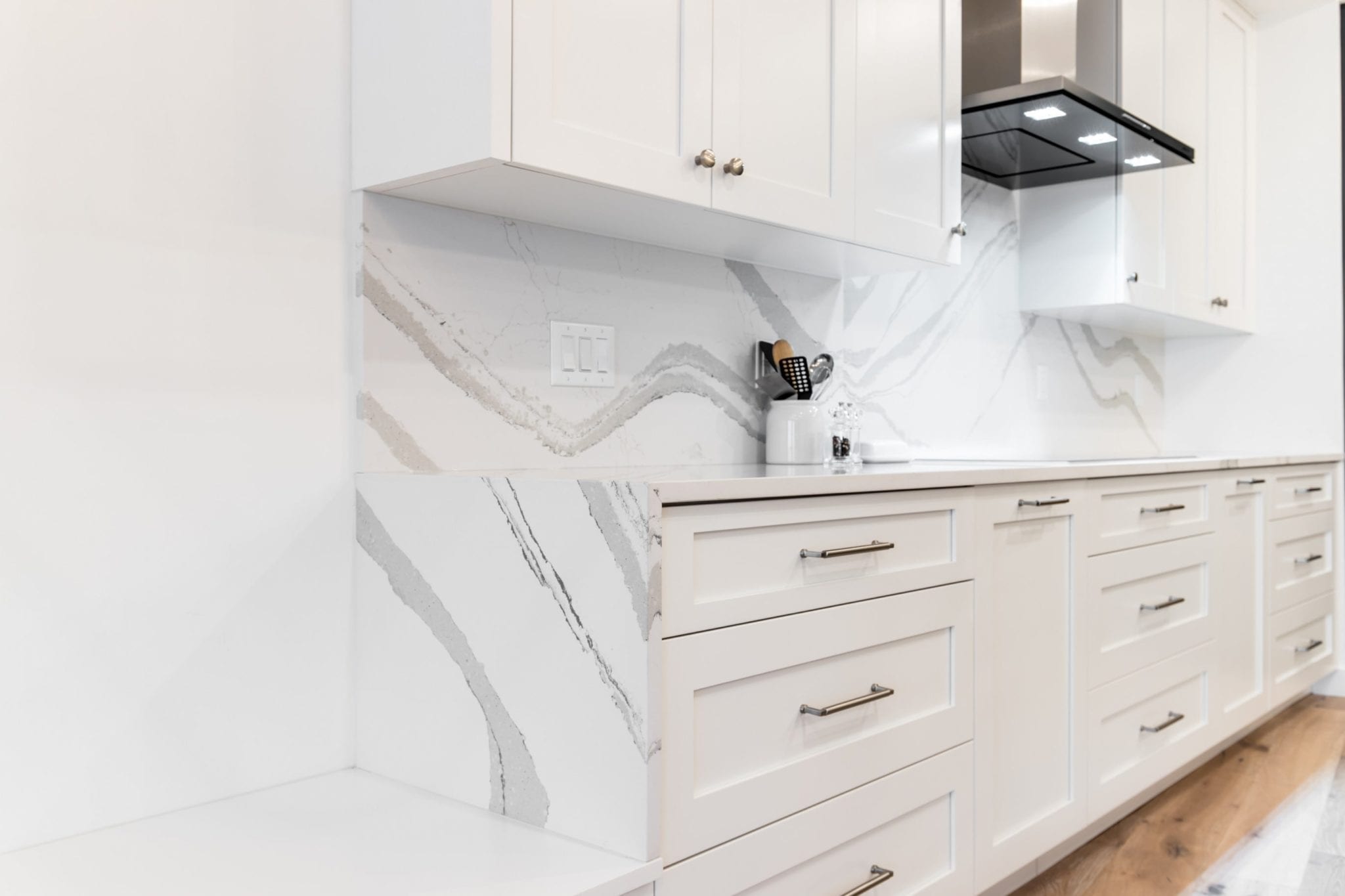 Living room view looking towards kitchen. You can see the Cambria Britannica Matte quartz backsplash in the background