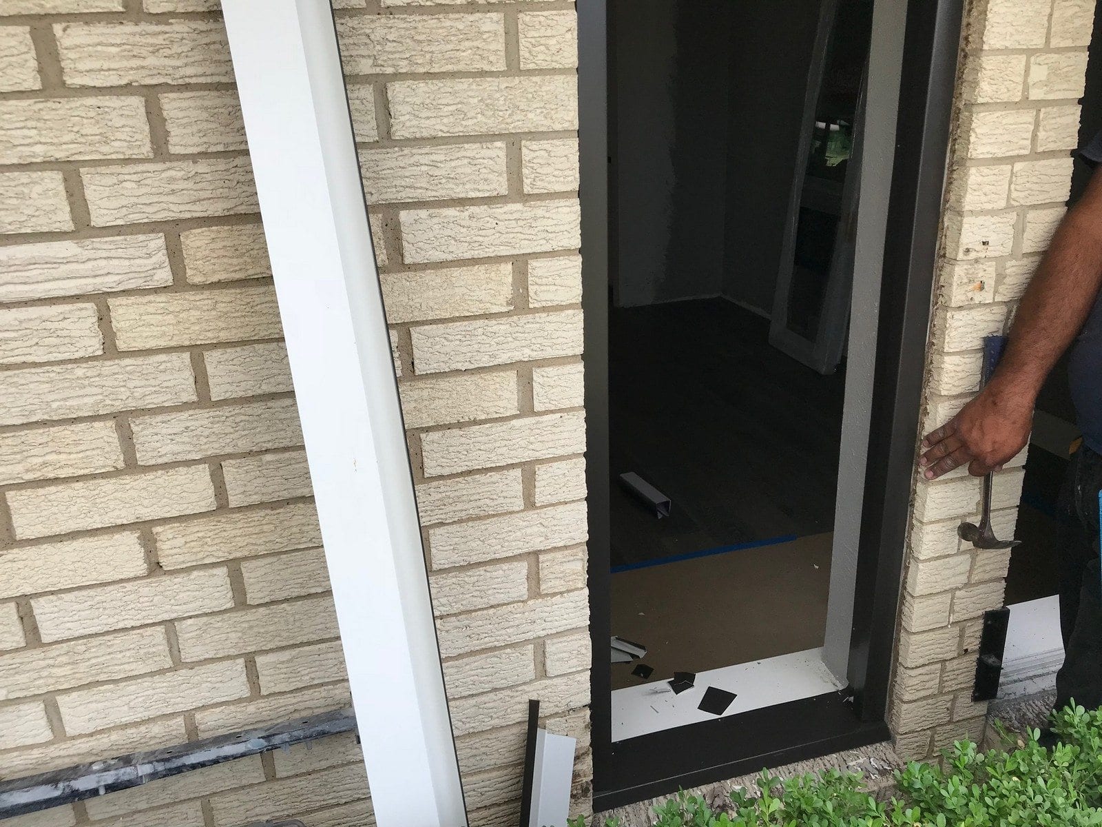 Step 3: The opening is prepared for the new window by installing a pan sill and then applying Peel-and-stick flashing membrane on the side jambs, and then the head. Then we cover the window frame with break metal painted to match your window color to conceal any color difference, gaps, or compensate for out of square openings. This cosmetic feature is a proprietary to Renowned Renovation, and gives an upscale finish to the window frame.