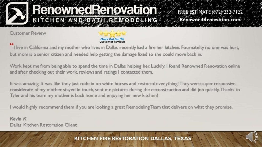 After a kitchen fire the homeowner’s son needed help with the Kitchen Fire Restoration so she could move back in. Only problem, he lives in California and her house is in Dallas.