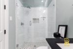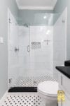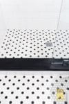 Renowned Renovation designed this walk-in shower with Brizo Tresa fixtures. The floor is a classic black and white 1"x 1' hex tile.